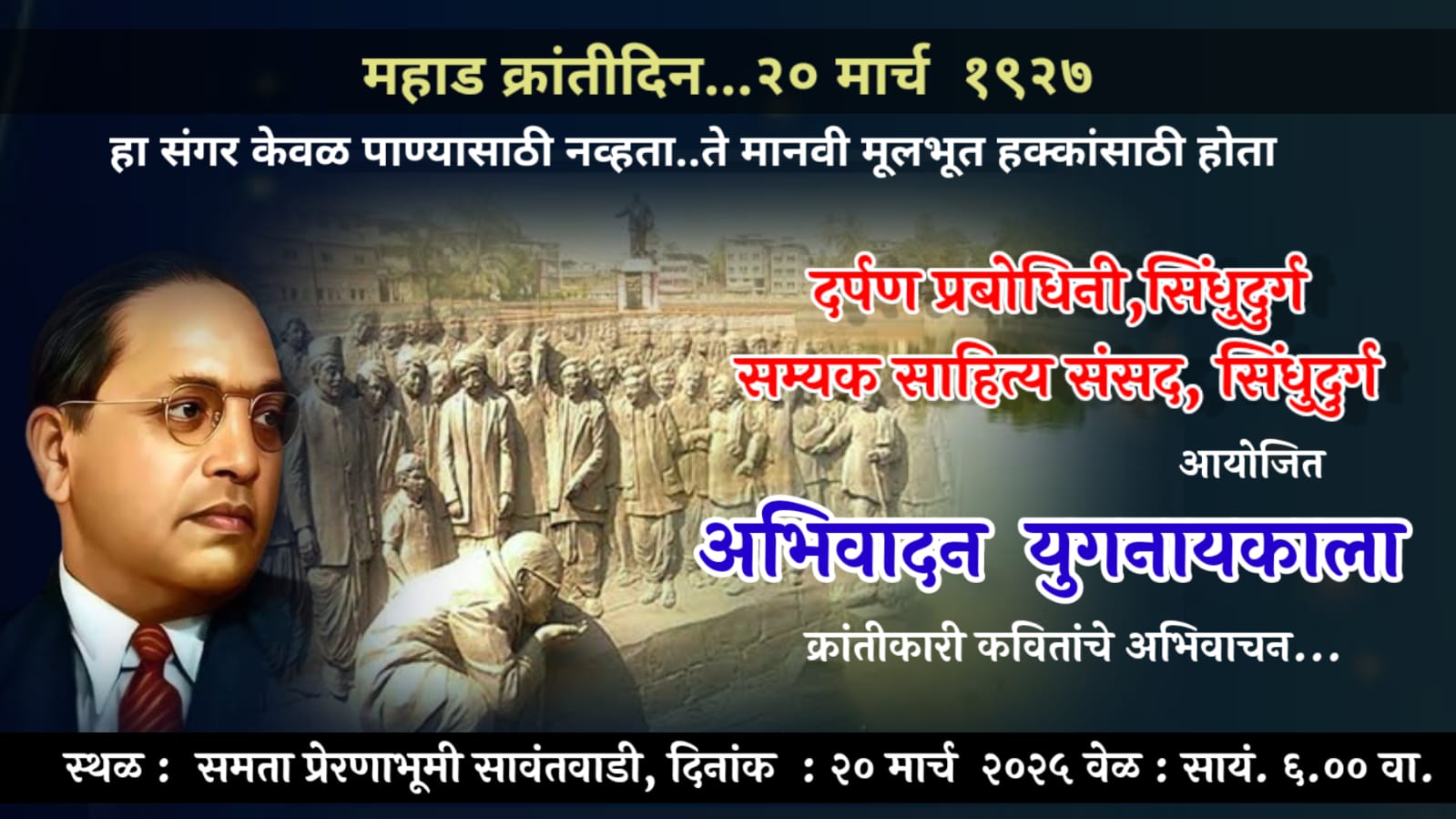 सावंतवाडी : २० मार्च हा भारताच्या इतिहासातील महाडच्या चवदार तळ्याचा क्रांती दिन. डाॅ. बाबासाहेब आंबेडकर यांनी या दिवशी मानवी हक्कांसाठी महाडच्या क्रांतीभूमीत रणशिंग फुंकले. या दिनाची आठवण म्हणून आपण दर्पण प्रबोधिनी सिंधुदुर्ग आणि सम्यक साहित्य संसद यांचे संयुक्त विद्यमाने ‘अभिवादन युगनायकाला’ – क्रांतीकारी कवितांचे अभिवाचन या विशेष कार्यक्रम आयोजन केले आहे. हा कार्यक्रम आज सायंकाळी ५ ते ८ या वेळेत सवन्त्व्बडी येथील डाॅ. बाबासाहेब आंबेडकर समता प्रेरणाभूमी, सावंतवाडी येथे संपन्न होणार आहे. तरी सर्वांनी उपस्थित राहून कार्यक्रमाच्या आयोजनासाठी सहकार्य करावे, असे आवाहन निमंत्रक दर्पण प्रबोधिनी, सिंधुदुर्ग व सम्यक साहित्य संसद, सिंधुदुर्ग यांनी केले आहे.