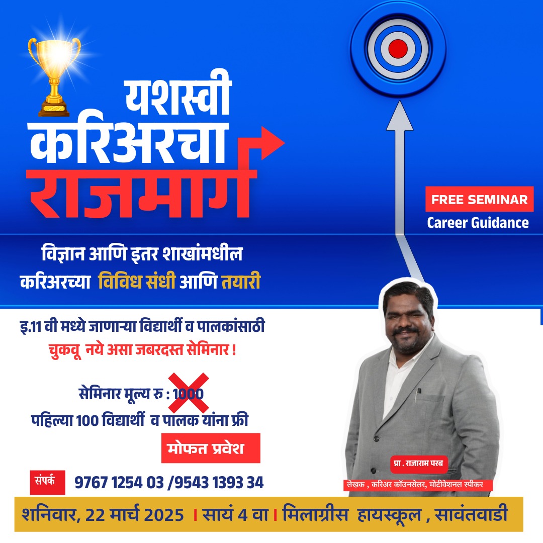 ‘यशस्वी करिअरचा राजमार्ग.!’ ; विद्यार्थी व पालकांसाठी विशेष कार्यशाळेचे २२ रोजी सावंतवाडी येथे आयोजन.