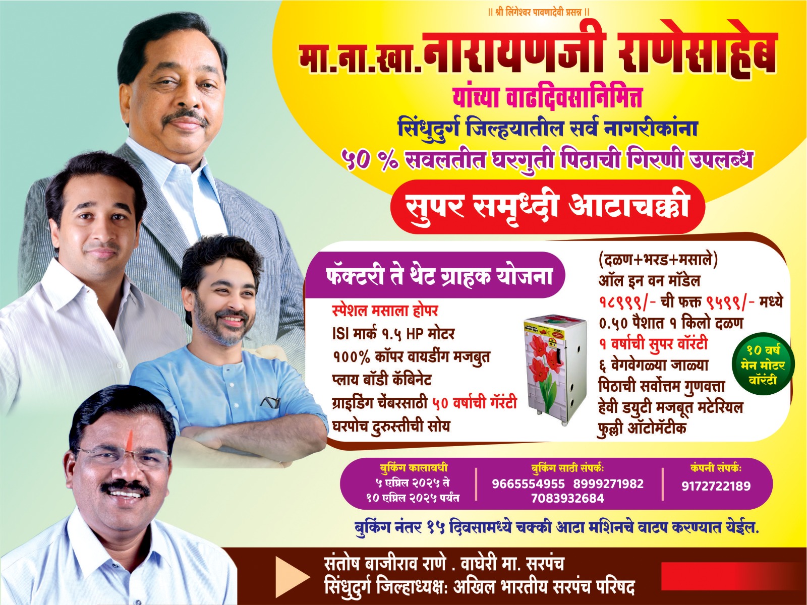 कणकवली : कोकणचे भाग्यविधाते माजी केंद्रीय मंत्री खासदार नारायण राणे यांच्या वाढदिवसानिमित्त सिंधुदुर्ग जिल्ह्यातील सर्व नागरिकांना 50 टक्के सवलतीत घरगुती पिठाची गिरण उपलब्ध करून देण्यात येणार आहे. सुपर समृद्धी आटा चक्की असे या आटा चक्की चे नाव असणार असून, थेट ग्राहक योजना अमलात आणली जाणार आहे. या मशीनची वैशिष्ट्ये पुढील प्रमाणे असणार असून, स्पेशल मसाला होपर, आयएसआय मार्क, 1.5 एचपी मोटर, 100% कॉपर वाइंडिंग, मजबूत बॉडी कॅबिनेट, ग्राइंडिंग चेंबर साठी पन्नास वर्षांची गॅरंटी, घरपोच दुरुस्ती सोय, दळण, भरड, मसाले, इ. साठी ऑल इन वन मॉडेल, 0.50 पैशात 1 किलो दळण, एक वर्षाचे सुपर वॉरंटी, सहा वेगवेगळ्या जाळ्या, पिठाची सर्वोत्तम गुणवत्ता, हेवी ड्युटी मजबूत मटेरियल, फुल ऑटोमॅटिक मशीन असणार आहे.