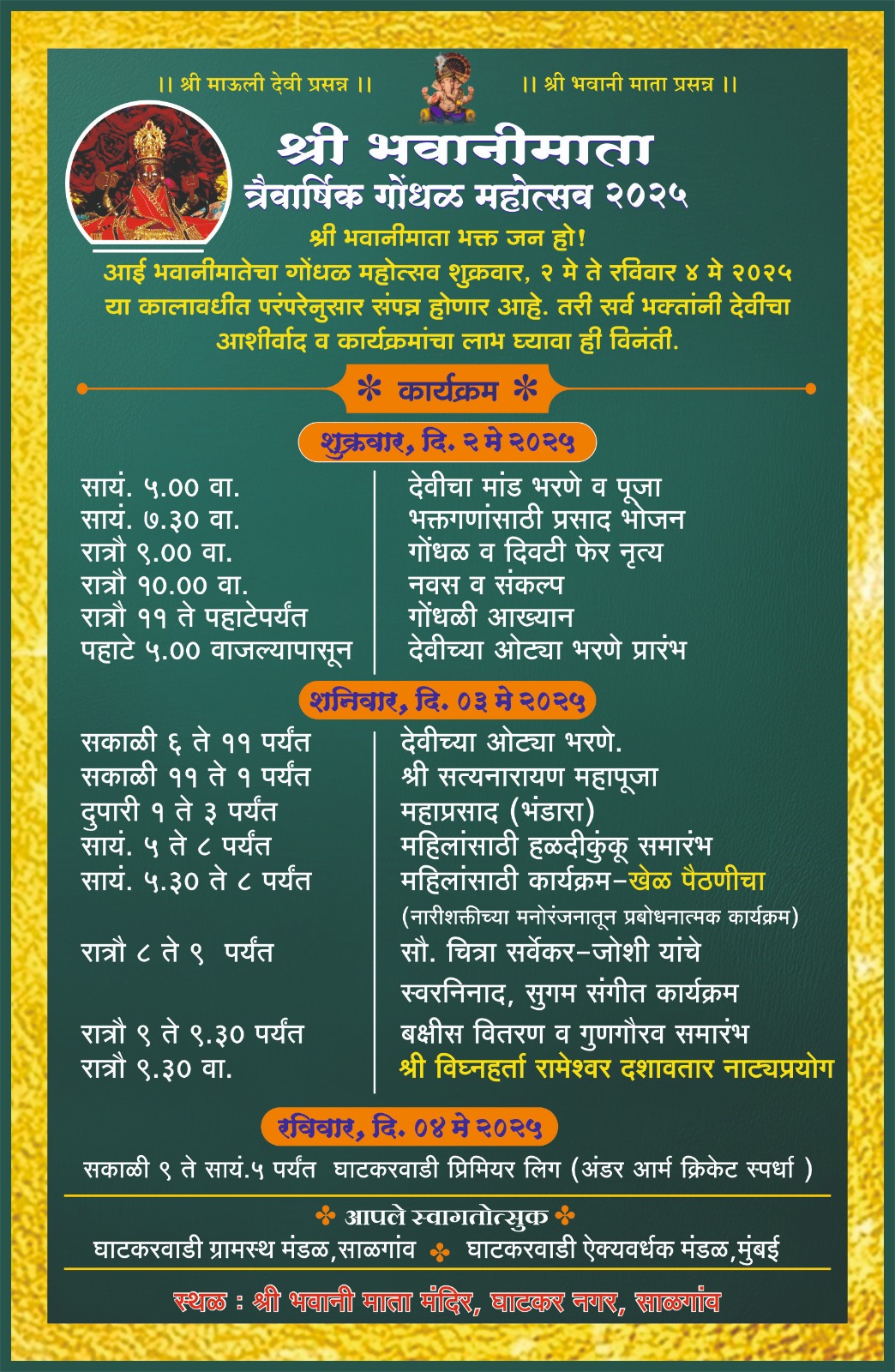 कुडाळ : तालुक्यातील साळगांव घाटकरवाडी येथे आई भवानीमातेचा त्रैवार्षिक गोंधळ महोत्सव शुक्रवार दिनांक २ मे ते रविवार दि. ४ मे २०२५ या कालावधीत परंपरेनुसार श्री भवानी माता मंदिर, घाटकरनगर, साळगांव येथे संपन्न होणार आहे. तरी सर्व भक्तांनी देवीचा आशीर्वाद व कार्यक्रमांचा लाभ घ्यावा, असे आवाहन आयोजक घाटकरवाडी ग्रामस्थ मंडळ, साळगांव आणि घाटकरवाडी ऐक्यवर्धक मंडळ, मुंबई यांनी केलं आहे.