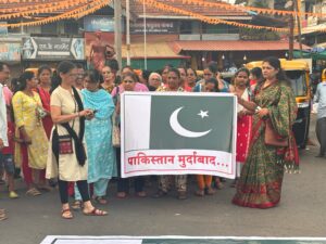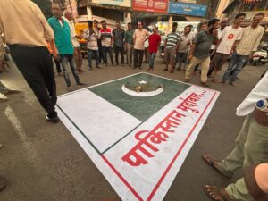 सावंतवाडी : विश्व हिंदू परिषद, सकल हिंदू समाज व देशप्रेमी नागरिकांच्यावतीने पाकिस्तान मुर्दाबादच्या घोषणा देत पाकिस्तानचा ध्वज जाळण्यात आला. काश्मीरमधील पेहेलगाममध्ये पाकीस्तान पुरस्कृत लष्कर ए तोयबाच्या संबंधीत आतंकवाद्यांनी धर्माची विचारणा करुन २६ निरपराध हिंदूंची गोळ्या घालून निघृण हत्या केली. उद्दामपणे महिलांशी वागणूक केली. केवळ हिंदू असल्याबद्दल निष्पाप लोकांचा जीव घेताना कपडे उतरवून मुस्लिमपणाची खात्री करुन घेतली. याचा निषेध नोंदवत पाकिस्तानचा ध्वज जाळून शहिदांना श्रध्दांजली वाहण्यात आली.