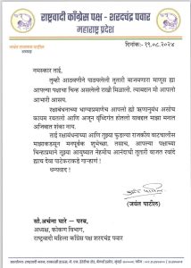 ताई, रक्षाबंधनाच्या आणि तुझ्या फुडल्या राजकीय वाटचालीक माझाकडसून मनःपूर्वक शुभेच्छा. तसाच, आपल्या पक्षाच्या चिन्हाप्रमाणे तूझ्या आयुष्यात नेहमीच आनंदाची तुतारी वाजत रवांदे ह्याच देवा पाटेकराकडे गाऱ्हाणं ! असे पत्र जयंतदादा पाटील यांनी अर्चनाताई यांना पाठविले.