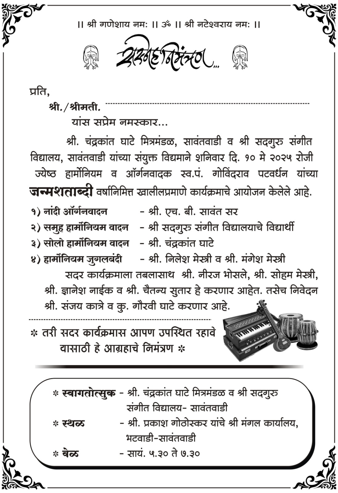 सावंतवाडी : येथील श्री चंद्रकांत घाटे मित्र मंडळ व श्री सद्गुरु संगीत विद्यालय सावंतवाडी यांच्या संयुक्त विद्यमाने शनिवार दिनांक १० मे रोजी ज्येष्ठ हार्मोनियम व ऑर्गनवादक स्वर्गीय पंडित गोविंदराव पटवर्धन यांच्या जन्मशताब्दी वर्षानिमित्त विविध कार्यक्रमाचे आयोजन केले आहे.