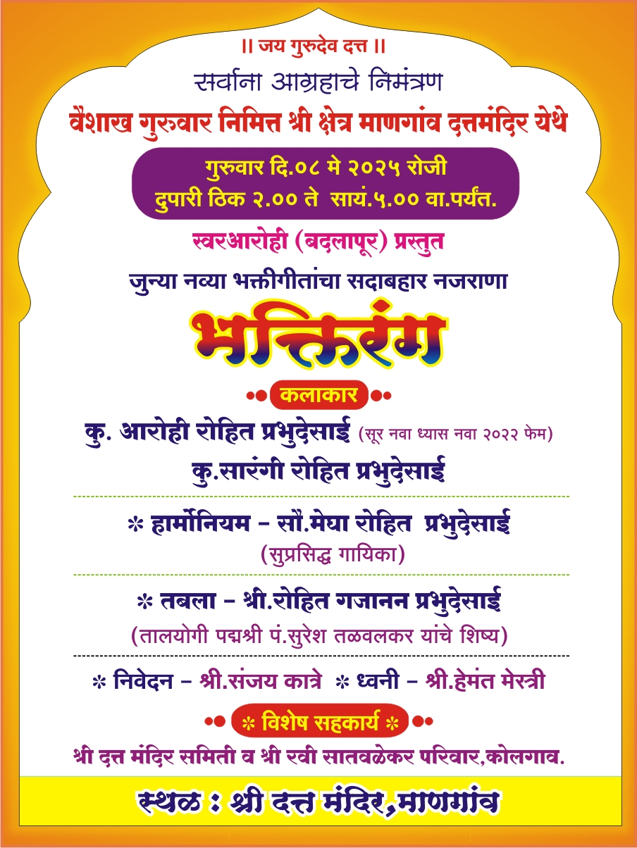 या बहारदार कार्यक्रमाचे निवेदन संजय कात्रे करणार असून ध्वनीची जबाबदारी हेमंत मेस्त्री सांभाळणार आहेत. विशेष सहकार्य श्री दत्त मंदिर समिती व श्री रवी सातवळेकर परिवार कोलगाव यांचे असून श्री दत्त मंदिर माणगाव येथे हा बहारदार कार्यक्रम संपन्न होणार आहे.