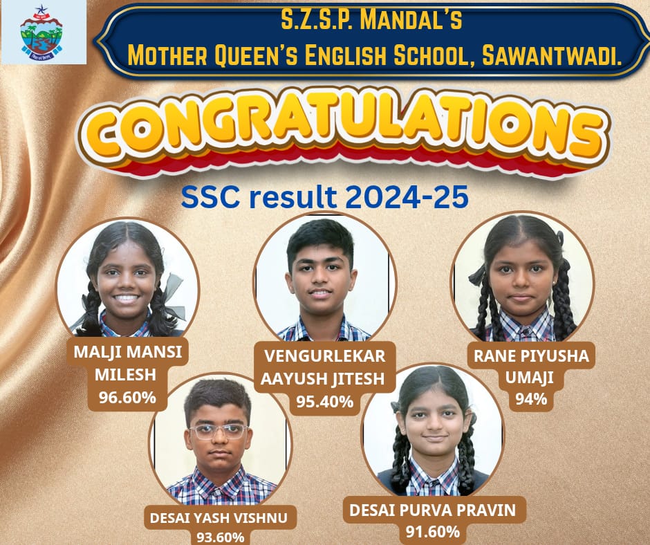 सावंतवाडी : सिंधुदुर्ग जिल्हा शिक्षण प्रसारक मंडळ संचलित मदर क्वीन्स् इंग्लिश स्कूलने प्रतिवर्षीप्रमाणे यंदाही माध्यमिक शालांत प्रमाणपत्र परीक्षेत उत्तुंग यश संपादित करून 100% निकालाची उज्ज्वल परंपरा कायम राखत पुनः एकदा शाळेच्या शिरपेचात मानाचा तुरा खोवला.