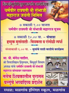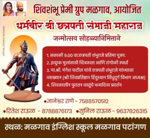 सावंतवाडी : तालुक्यातील मळगाव येथे पहिल्यांदाच धर्मवीर श्री छत्रपती संभाजी महाराज यांचा जन्मोत्सव सोहळा १४ मे रोजी विविध कार्यक्रमांनी साजरा करण्यात येणार आहे. मळगाव येथील शिवशंभू प्रेमी ग्रुपच्यावतीने मळगाव इंग्लिश स्कूल मळगावच्या पटांगणावर या जन्मोत्सव सोहळ्याचे आयोजन करण्यात आले आहे.