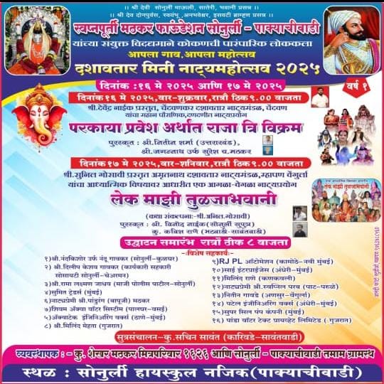 प्रस्तुत अमृतनाथ दशावतार नाटयमंडळ म्हापण वेंगुर्ला यांचा आध्यात्मिक विषयावर एक आगळावेगळा नाट्यप्रयोग ‘लेक माझी तुळजाभवानी’ हा होणार आहे. तरी दोन्ही दिवस रसिकमायबापांनी या सुवर्णसंधीचा लाभ घ्यावा, असे आवाहन सोनुर्ली पाक्याचीवाडीतील ग्रामस्थांकडून करण्यात आले आहे.