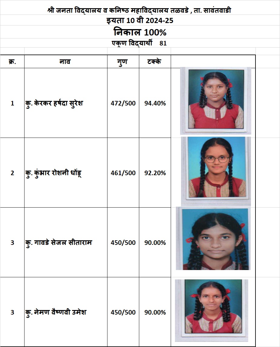 सावंतवाडी : तालुक्यातील तळवडे येथील शिक्षण प्रसारक मंडळ, तळवडे संचलित श्री जनता विद्यालय व कनिष्ठ महाविद्यालयाचा दहावी परीक्षेचा निकाल १०० टक्के लागला असून या परीक्षेला एकूण ८१ विद्यार्थी प्रविष्ट झाले होते. सर्व विदयार्थी उत्तीर्ण होऊन विद्यालयाचा निकाल १०० टक्के लागला.