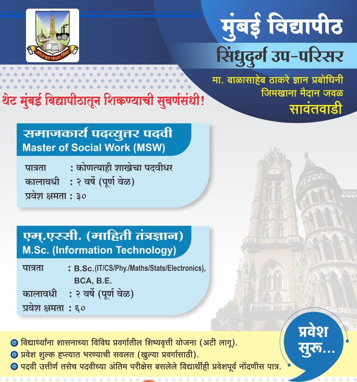 सावंतवाडी : शैक्षणिक वर्ष २०२५-२६ साठी मुंबई विद्यापीठाच्या सिंधदुर्ग उप परिसराच्या अंतर्गत समाजकार्य (एम. एस. डब्ल्यू.) व एम.एस्सी. (माहिती तंत्रज्ञान) या पदव्युत्तर पदवी अभ्यासक्रमाची प्रवेश प्रक्रिया सावंतवाडी येथे सुरू झाली आहे. इच्छुक विद्यार्थ्यांनी https://muadmission.samarth.edu.in/ या वेबसाईटवर जाऊन ऑनलाइन पद्धतीने अर्ज ०३ जून २०२५ या अंतिम दिनांक पूर्वी भरावयाचा आहे.