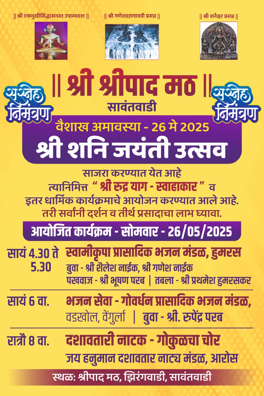 सावंतवाडी : श्री श्रीपाद मठ सावंतवाडीत आज श्री शनि जयंती उत्सव साजरा करण्यात येत आहे. त्यानिमित्त ‘श्री रुद्र याग – स्वाहाकार” व इतर धार्मिक कार्यक्रमांचे आयोजन करण्यात आले आहे. तरी सर्वांनी दर्शन व तीर्थ प्रसादाचा लाभ घ्यावा, असे आवाहन करण्यात आले आहे.