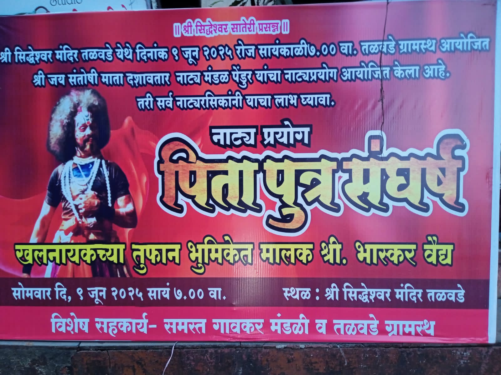सावंतवाडी : .तालुक्यातील तळवडे येथील ग्रामस्थ मंडळी आयोजित श्री सिद्धेश्वर मंदिरात उद्या सोमवार ९ जून रोजी सायंकाळी ७ वाजता श्री जय संतोषी माता दशावतार नाट्य मंडळ पेंडूर यांचा “ पिता पुत्र संघर्ष “ हा नाट्यप्रयोग होणार आहे.लाभ घेण्याचे आवाहन मंडळातर्फे करण्यात आले आहे.