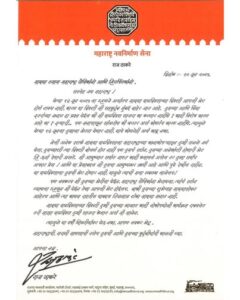 मुंबई : मनसे अध्यक्ष राज ठाकरे यांनी आपल्या पदाधिकाऱ्यांसह मनसे कार्यकर्त्यांना पत्र लिहिले आहे. येत्या १४ जून रोजी वाढदिवसाच्या दिवशी मनसैनिकांना शिवतीर्थावर भेटू शकणार नाही, असं त्यांनी या पत्रात म्हटलं आहे. तर वाढदिवसाच्या निमित्ताने राज ठाकरे हे कुटुंबासोबत मुंबईबाहेर जाणार आहे. तर १४ जून रोजी मनसैनिकांनी लोकोपयोगी कार्यक्रम राबवावे, असे आवाहन देखील राज ठाकरे यांनी पत्राद्वारे केले आहे.