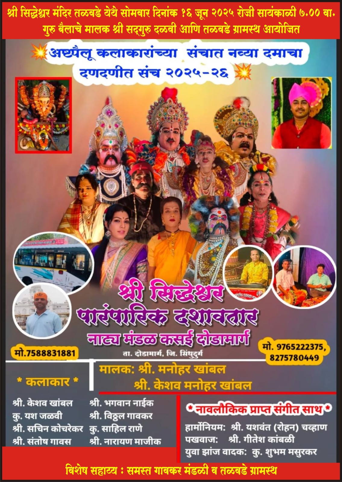 सावंतवाडी : सद्गगुरु दळवी आणि तळवडे ग्रामस्थ आयोजित श्री सिद्धेश्वर मंदिरात सोमवार १६ जून रोजी सायंकाळी ७ वाजता श्री सिद्धेश्वर पारंपारीक दशावतार नाट्य मंडळ कसई = दोडामार्ग यांचा नाट्यप्रयोग होणार आहे. यात केशव खांबल,यश जळवी,सचिन कोचरेकर,संतोष गावस,भगवान नाईक,विठ्ठल गावकर,साहिल राणे,नारायण माजीक या कलाकारांचा समावेश आहे.तसेच हार्मोनियम यशवंत चव्हाण पखवाज गीतेश कांबळी झांजवादक शुभम मसुरकर साथ देणार आहे.
