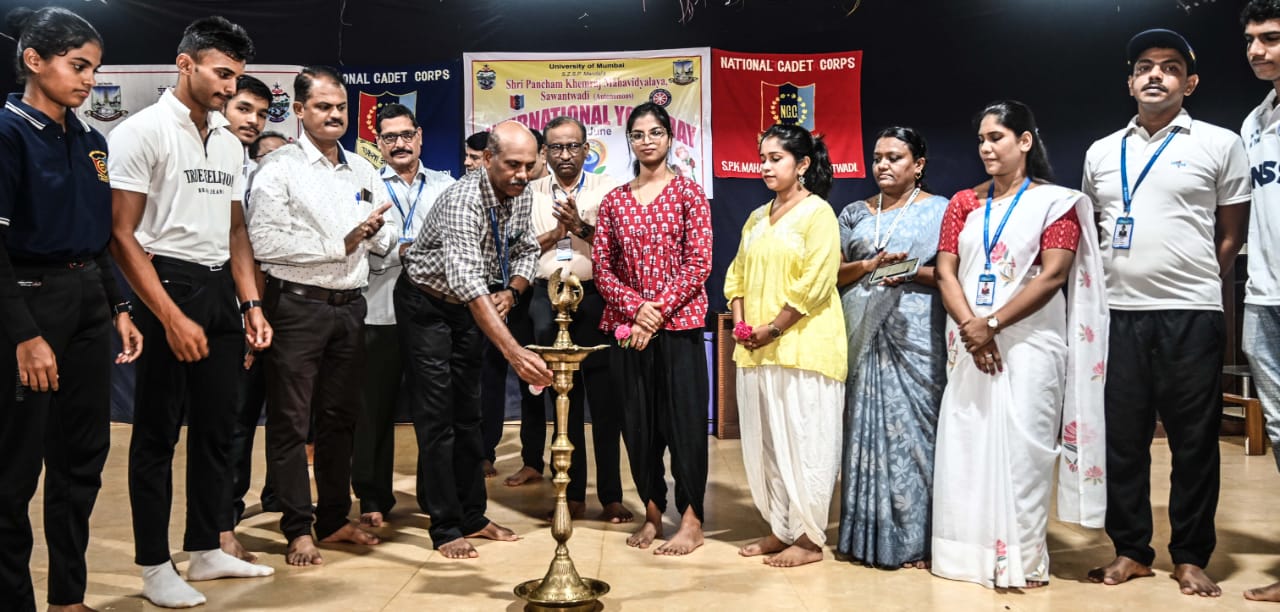 सावंतवाडी : सिंधुदुर्ग जिल्हा शिक्षण प्रसारक मंडळ संचलित श्री पंचम खेमराज महाविद्यालय सावंतवाडी येथे दिनांक 21 जून 2025 रोजी आंतरराष्र्टीय योग दिन मोठ्या उत्साहात व शिस्तबद्ध पद्धतीने साजरा करण्यात आला. या कार्यक्रमाचे आयोजन महाविद्यालयाच्या एनएसएस, एनसीसी, डी.एल.एल.ई आणि क्रीडा विभागाच्या संयुक्त विद्यमाने करण्यात आले होते. कार्यक्रमाच्या अध्यक्षस्थानी प्रभारी प्राचार्य प्रा. एम. ए. ठाकूर होते. या वेळी एनएसएस कार्यक्रमाधिकारी डॉ. यू. सी. पाटील, डॉ. सुनयना जाधव, प्रा. रोहन सावंत, एनसीसी ANO डॉ. सचिन देशमुख, डॉ. विशाल अपराध, CTO प्रा. सौ. कविता तळेकर, आय.क्यु.ए.सी समन्वयक डाॅ. बी. एन. हिरामणी, वनस्पतीशास्र विभागप्रमुख डाॅ. यु. एल. देठे यांची प्रमुख उपस्थिती होती.
