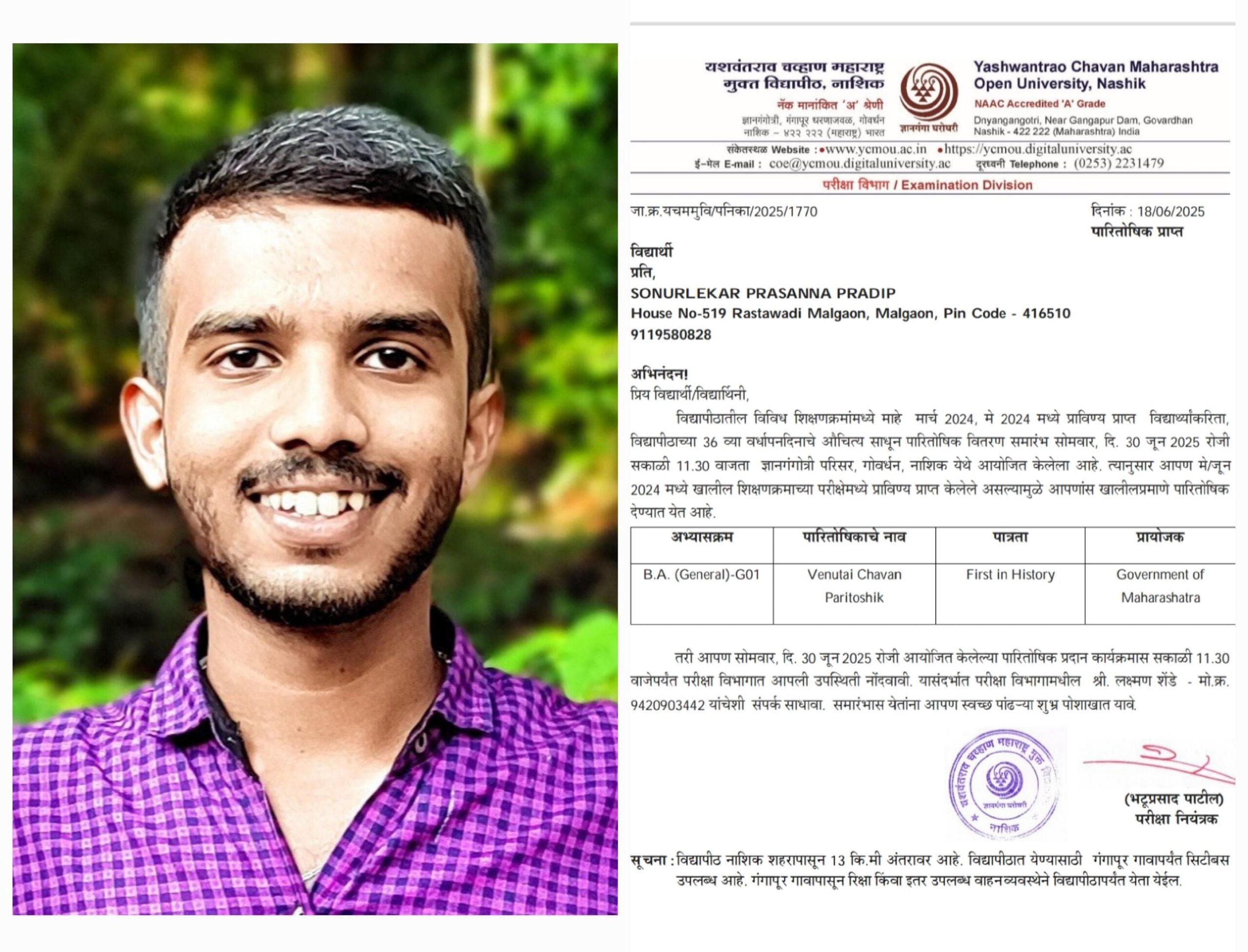 मळगाव : येथील प्रसन्न प्रदीप सोनुर्लेकर याने यशवंतराव चव्हाण महाराष्ट्र मुक्त विद्यापीठातर्फे जून २०२४ मध्ये घेण्यात आलेल्या तृतीय वर्ष पदवी परीक्षेत इतिहास विषयातून विद्यापीठात प्रथम क्रमांक पटकावला आहे. प्रसन्न हा सावंतवाडी येथील आरपीडी ज्युनियर कॉलेज कॅम्पसमधील डॉ. जे.बी. नाईक आर्ट्स अँड कॉमर्स कॉलेज अभ्यासकेंद्राचा विद्यार्थी आहे.