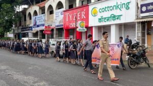 सावंतवाडी : जागतिक अंमली पदार्थ विरोधी दिनानिमित्त गुरुवार दिनांक 26 जून 2025 रोजी सिंधुदुर्ग जिल्हा पोलीस विभागाच्या वतीने आयोजित अंमली पदार्थ विरोधी प्रभातफेरी व जनजागृती कार्यक्रमात सिंधुदुर्ग जिल्हा शिक्षण प्रसारक मंडळ संचलित मदर क्वीन्स इंग्लिश स्कूल सावंतवाडी चे इयत्ता नववी व दहावीतील विद्यार्थी व शिक्षक सहभागी झाले. अंमली पदार्थ विरोधी प्रभातफेरी भोसले उद्यान ते गांधी चौक सावंतवाडी या दरम्यान आयोजित करण्यात आली. यावेळी विद्यार्थ्यांनी अंमली पदार्थांच्या दुष्परिणामांबद्दल जनजागृतीपर घोषणा दिल्या आणि घोषफलकांद्वारे जनजागृती करण्याचा प्रयत्न केला. या रॅलीत पोलीस निरीक्षक मा.अमोल चव्हाण यांच्यासह चार अंमलदार सहभागी झाले.
