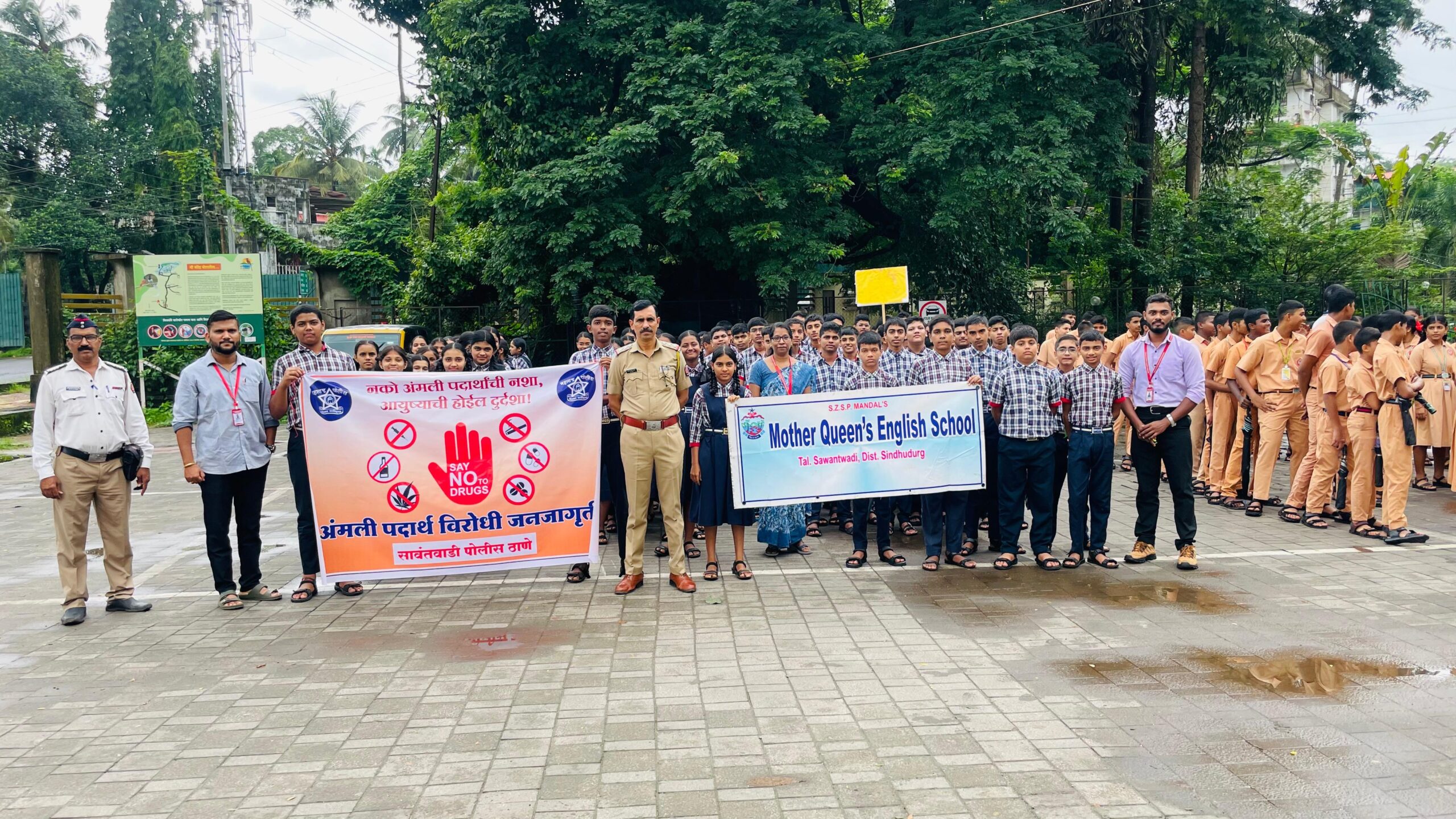 सावंतवाडी : जागतिक अंमली पदार्थ विरोधी दिनानिमित्त गुरुवार दिनांक 26 जून 2025 रोजी सिंधुदुर्ग जिल्हा पोलीस विभागाच्या वतीने आयोजित अंमली पदार्थ विरोधी प्रभातफेरी व जनजागृती कार्यक्रमात सिंधुदुर्ग जिल्हा शिक्षण प्रसारक मंडळ संचलित मदर क्वीन्स इंग्लिश स्कूल सावंतवाडी चे इयत्ता नववी व दहावीतील विद्यार्थी व शिक्षक सहभागी झाले. अंमली पदार्थ विरोधी प्रभातफेरी भोसले उद्यान ते गांधी चौक सावंतवाडी या दरम्यान आयोजित करण्यात आली. यावेळी विद्यार्थ्यांनी अंमली पदार्थांच्या दुष्परिणामांबद्दल जनजागृतीपर घोषणा दिल्या आणि घोषफलकांद्वारे जनजागृती करण्याचा प्रयत्न केला. या रॅलीत पोलीस निरीक्षक मा.अमोल चव्हाण यांच्यासह चार अंमलदार सहभागी झाले.