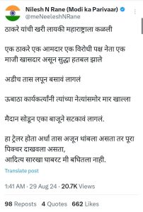 माजी खासदार निलेश राणे म्हणतात की, ठाकरे यांची खरी लायकी महाराष्ट्राला कळली. एक ठाकरे, एक आमदार, एक विरोधी पक्ष नेता, एक माजी खासदार असून सुद्धा हतबल झाले. अडीच तास त्यांना लपून बसावं लागलं. उबाठा कार्यकर्त्यांनी त्यांच्या नेत्यांसमोर मार खाल्ला. मैदान सोडून एका बाजूने सटकाव लागलं, हा ट्रेलर होता अर्धा तास अजून थांबला असता तर पुरा पिक्चर दाखवला असता, आदित्यसारखा घाबरट मी बघितला नाही, असा हल्लाबोल आपल्या ट्विटरवरून माजी खासदार निलेश राणे यांनी केला आहे.