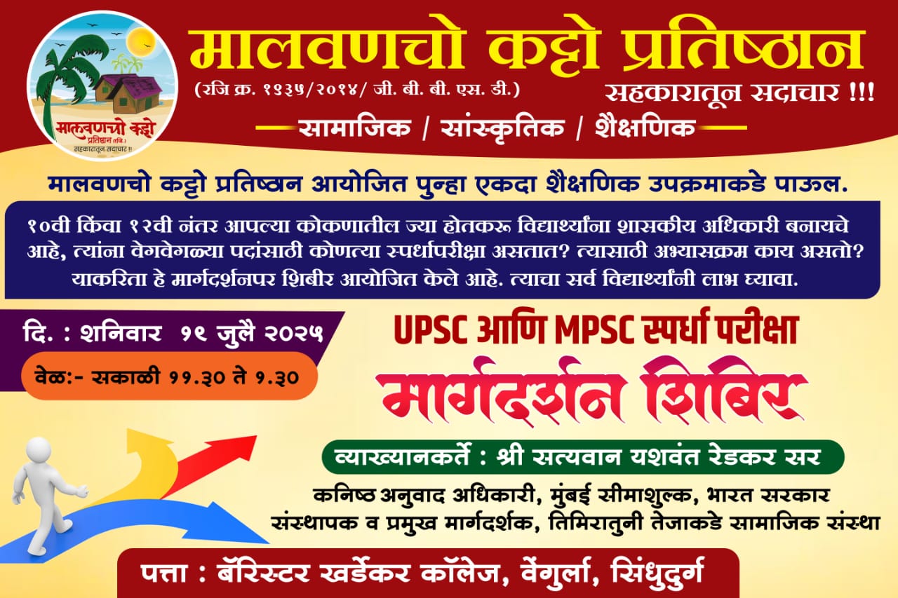 वेंगुर्ला : महाराष्ट राज्यातून दहावी बारावी परीक्षांमध्ये कोकण बोर्ड अव्वल येते. परंतु पुढे शासकीय अधिकारी म्हणून कोकणातील मुले पुढे येत नाहीत कारण शासकीय स्पर्धा परीक्षांचे त्यांना योग्य मार्गदर्शन मिळत नाही. कोकणातील मुलांची ही अडचण जाणून सिंधुदुर्गातील मुलांना शासकीय अधिकारी बनण्यासाठी योग्य मार्गदर्शन मिळावे यासाठी मुंबईस्थित “मालवणचो कट्टो प्रतिष्ठानने” कोकणचेच सुपुत्र असलेले कनिष्ठ अनुवाद अधिकारी मुंबई सीमाशुल्क सत्यवान यशवंत रेडकर यांचे निःशुल्क शासकीय स्पर्धा परीक्षा मार्गदर्शन व्याख्यान बॅरिस्टर खर्डेकर महाविद्यालय वेंगुर्ला येथे शनिवार दिनांक १९ जुलै २०२५ रोजी सकाळी ११.३० वाजता आयोजित केले आहे.