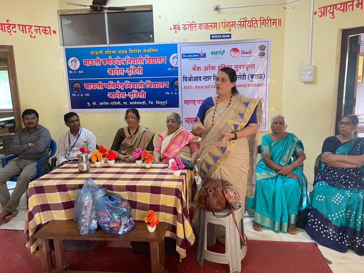 सावंतवाडी : आपल्या भारत देशाला विकसित करण्यासाठी प्रत्येकाचे योगदान महत्त्वपूर्ण आहे. त्यासाठी आत्मनिर्भर बनणे देखील तेवढेच गरजेचे आहे. कोणताही उद्योग हा कमी नसतो. ‘थेंबे थेंबे तळे साचे’ या उक्तीप्रमाणे छोट्या छोट्या उद्योगातूनच गगनभरारी घेता येते. म्हणून प्रत्येकाने छोट्या उद्योगांचे प्रशिक्षण घेऊन आपली प्रगती साधावी, असे मत आजगाव सरपंच यशस्वी सौदागर यांनी व्यक्त केले. आरोस – दांडेली येथे आयोजित कार्यक्रमात त्या बोलत होत्या.