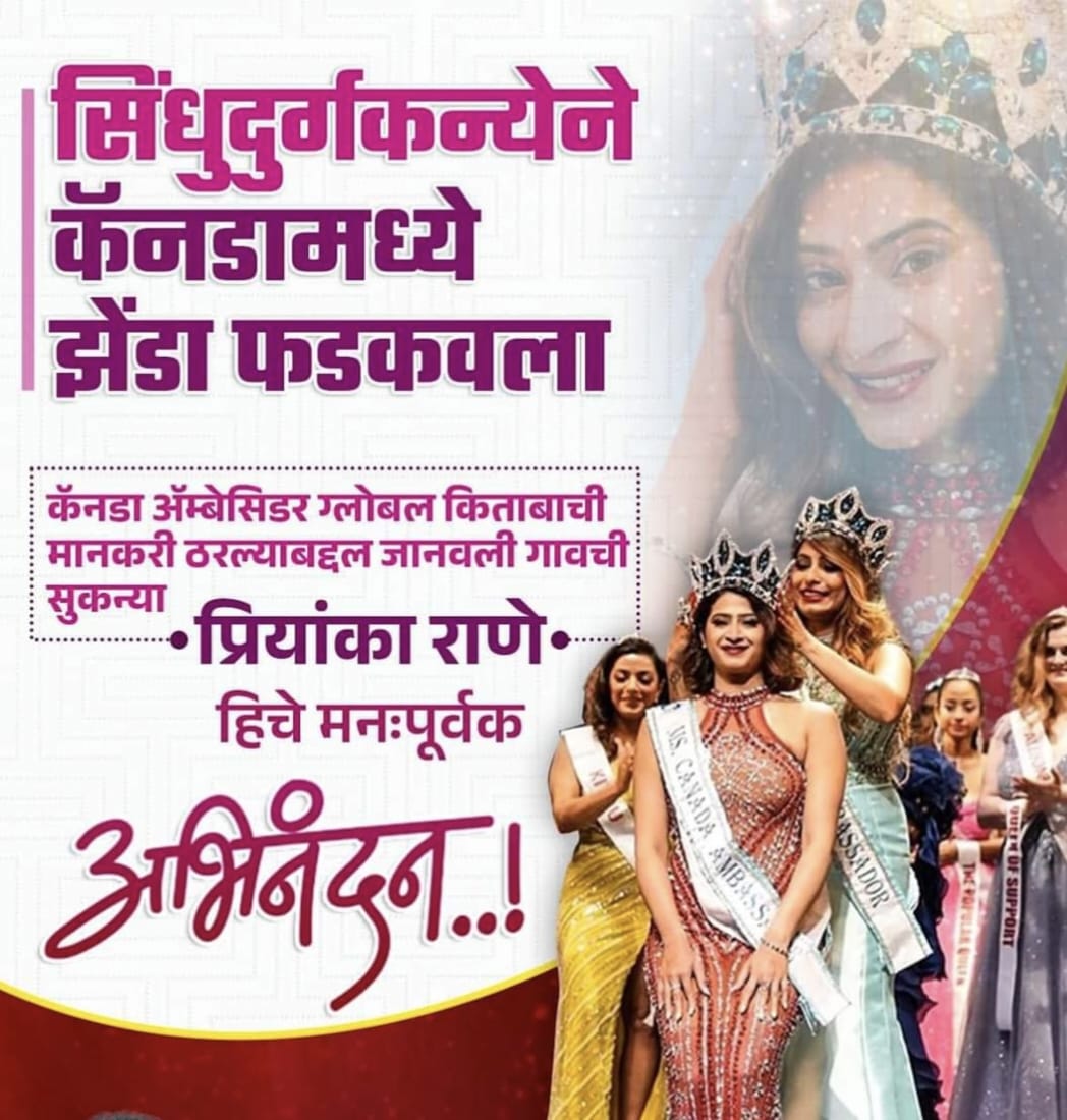 सिंधुदुर्ग : कणकवली तालुक्यातील जानवली गावची सुकन्या प्रियांका राणे हिने सातासमुद्रापार असलेल्या कॅनडामध्ये भारताचा तिरंगा अभिमानाने उंचावला आहे. ती कॅनडा ॲम्बेसिडर ग्लोबल किताबाची मानकरी ठरली आहे. या देदीप्यमान यशामुळे आपल्या सिंधुदुर्ग जिल्ह्याच्या शिरपेचात मानाचा तुरा रोवला गेला आहे. याबद्दल प्रियांका राणे हिचे सर्व स्तरातून हार्दिक अभिनंदन होत आहे.