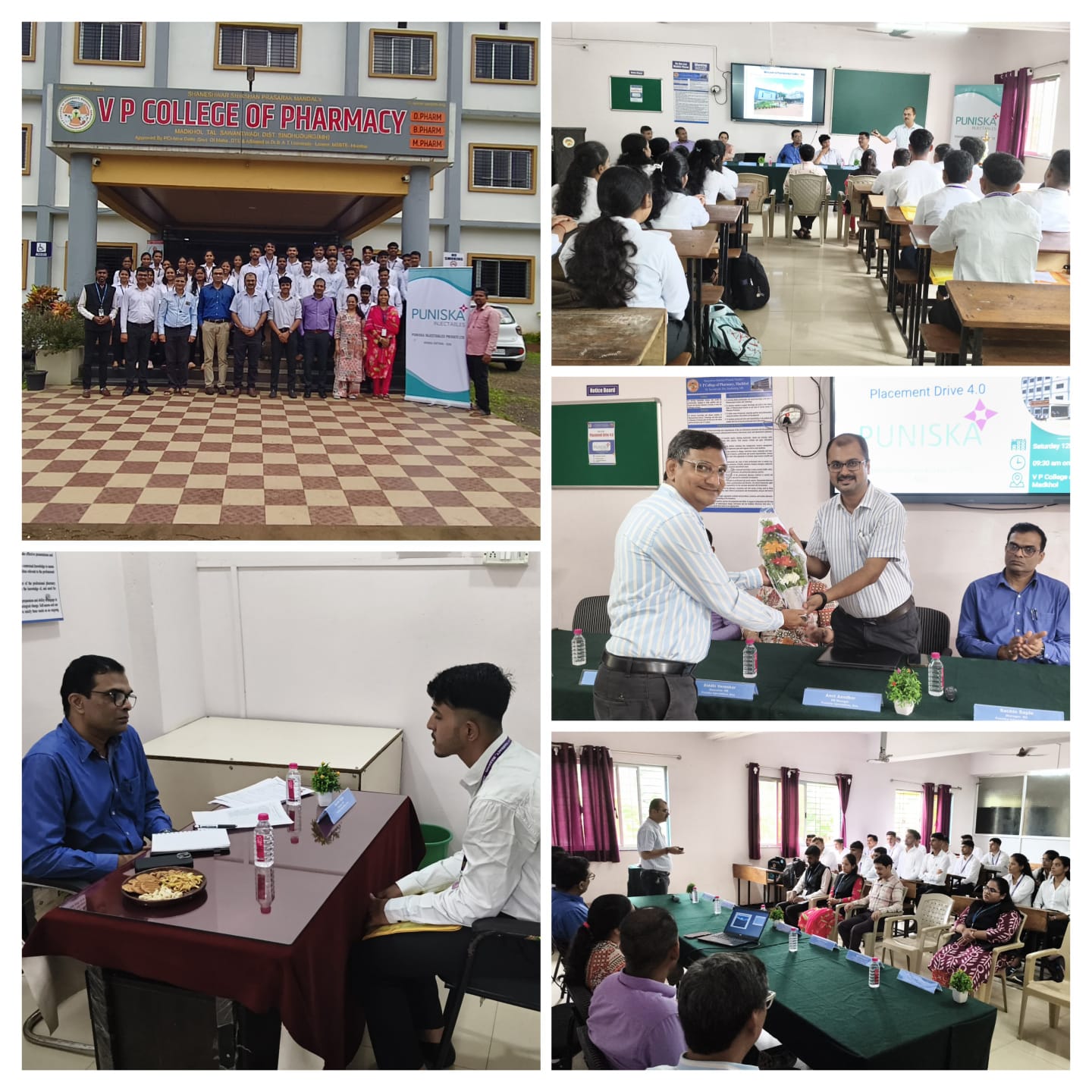 व्ही. पी. कॉलेज ऑफ फार्मसी माडखोलच्या विद्यार्थ्यांची गोव्यातील पुनिस्का इंजेक्टेबल्स फार्मा कंपनीत निवड!व्ही पी कॉलेज ऑफ फार्मसी माडखोल मार्फत चालू शैक्षणिक वर्ष २०२५ मध्ये डी फार्मसी, बी फार्मसी आणि एम फार्मसी विद्यार्थांसाठी माहे जून २०२५ अखेर पर्यंत तीन प्लेसमेंट ड्राईव्ह आयोजित करण्यात आले. १२ जुलै २०२५ रोजी महाविद्यालयाने चौथा कॅम्पस प्लेसमेंट ड्राईव्ह आयोजित करण्यात आला. या प्लेसमेंट ड्राईव्ह मध्ये गोव्यातील पुनिस्का इंजेक्टेबल्स फार्मा मार्फत प्रोडक्शन आणि क्वालिटी अश्युरन्स डिपार्टमेंट साठी एकूण २५ विद्यार्थांच्या मुलाखती घेण्यात आल्या. त्यामध्ये पाच विद्यार्थ्यांची प्रोडक्शन डिपार्टमेंट आणि पाच विद्यार्थ्यांची क्वालिटी क्वालिटी अश्युरन्स डिपार्टमेंट अशी एकूण दहा विद्यार्थांची निवड करण्यात आली.