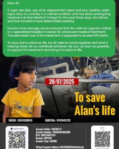सावंतवाडी : येथील मिलाग्रीस शाळेत इयत्ता आठवी C मध्ये शिकत असलेली अमला विजेश हिचा पाच वर्षांचा भाऊ ॲलन वीजेश याला किडनी व लिव्हरचा गंभीर आजार झाला असून त्याला पुढील उपचारांसाठी तातडीने केरळच्या विशेष रुग्णालयात दाखल करण्याचा सल्ला डॉक्टरांनी दिला आहे.