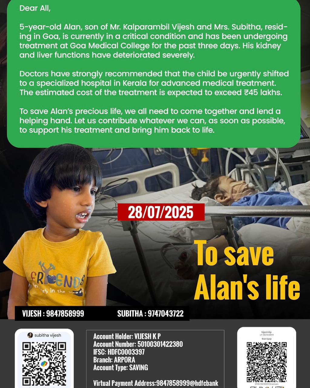 त्याच्या वैद्यकीय उपचारांसाठी आर्थिक मदतीची नितांत गरज आहे. या उपचारांसाठी सुमारे 45 लाख रुपये खर्च आहे. यासाठी ॲलनच्या पालकांनी समाजातील दानशूर व्यक्तींना कळकळीची विनंती केली आहे. जे या पाच वर्षाच्या मुलासाठी आर्थिक मदत करू इच्छितात त्यांनी खालील फोटोमधील UPI आयडीवर आर्थिक मदत करावी ही विनंती.