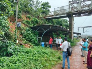 कुडाळ : कोकण रेल्वे प्रवासी समन्वय व संघर्ष समिती सिंधुदुर्गच्या माध्यमातून पुकारलेल्या १ ऑगस्ट रोजी च्या आंदोलनाच्या पार्श्वभूमीवर कोकण रेल्वेच्या अधिकाऱ्यांनी आज कुडाळ रेल्वे स्थानकात समस्यांबाबत समितीचे पदाधिकारी व स्थानिक प्रवासी, रिक्षा संघटना सोबत भेट देऊन चर्चा केली. रेल्वे स्थानकातील भेटी दरम्यान प्रवासी निवारा शेड, प्लॅटफॉर्म वर वाढलेले गवत, छप्पर कोसळण्याच्या स्थितीत असलेले निवारा शेड, पिण्याच्या पाण्याच्या ठिकाणी असलेले अस्वच्छता, प्लॅटफॉर्म क्रमांक १ वर वाढलेली झाडे, बंद असलेली वायफाय सुविधा असे अनेक प्रकार समितीच्या माध्यमातून व प्रवाशांच्या माध्यमातून रेल्वे स्थानक पाहणी करण्यासाठी आलेल्या रेल्वे कर्मचाऱ्यांच्या निदर्शनास आणून दिले. धक्कादायक प्रकार म्हणजे मुंबईच्या दिशेने जाणाऱ्या प्लॅटफॉर्म वरील निवारा शेडच्या मागे दरड कोसळण्याच्या स्थितीत असून सुद्धा अजूनही कोणतीही उपाययोजना केली नाही. रेल्वे प्रशासन एखाद्या प्रवाशाचा जीव जाण्याची वाट बघत आहे का? असा प्रश्न प्रवासी संघटनेच्या पदाधिकाऱ्यांनी संबंधित रेल्वे अधिकाऱ्यांसमोर उपस्थित केला.