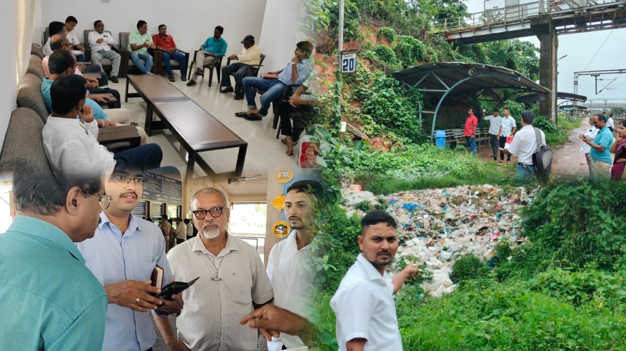कुडाळ : कोकण रेल्वे प्रवासी समन्वय व संघर्ष समिती सिंधुदुर्गच्या माध्यमातून पुकारलेल्या १ ऑगस्ट रोजी च्या आंदोलनाच्या पार्श्वभूमीवर कोकण रेल्वेच्या अधिकाऱ्यांनी आज कुडाळ रेल्वे स्थानकात समस्यांबाबत समितीचे पदाधिकारी व स्थानिक प्रवासी, रिक्षा संघटना सोबत भेट देऊन चर्चा केली. रेल्वे स्थानकातील भेटी दरम्यान प्रवासी निवारा शेड, प्लॅटफॉर्म वर वाढलेले गवत, छप्पर कोसळण्याच्या स्थितीत असलेले निवारा शेड, पिण्याच्या पाण्याच्या ठिकाणी असलेले अस्वच्छता, प्लॅटफॉर्म क्रमांक १ वर वाढलेली झाडे, बंद असलेली वायफाय सुविधा असे अनेक प्रकार समितीच्या माध्यमातून व प्रवाशांच्या माध्यमातून रेल्वे स्थानक पाहणी करण्यासाठी आलेल्या रेल्वे कर्मचाऱ्यांच्या निदर्शनास आणून दिले. धक्कादायक प्रकार म्हणजे मुंबईच्या दिशेने जाणाऱ्या प्लॅटफॉर्म वरील निवारा शेडच्या मागे दरड कोसळण्याच्या स्थितीत असून सुद्धा अजूनही कोणतीही उपाययोजना केली नाही. रेल्वे प्रशासन एखाद्या प्रवाशाचा जीव जाण्याची वाट बघत आहे का? असा प्रश्न प्रवासी संघटनेच्या पदाधिकाऱ्यांनी संबंधित रेल्वे अधिकाऱ्यांसमोर उपस्थित केला.