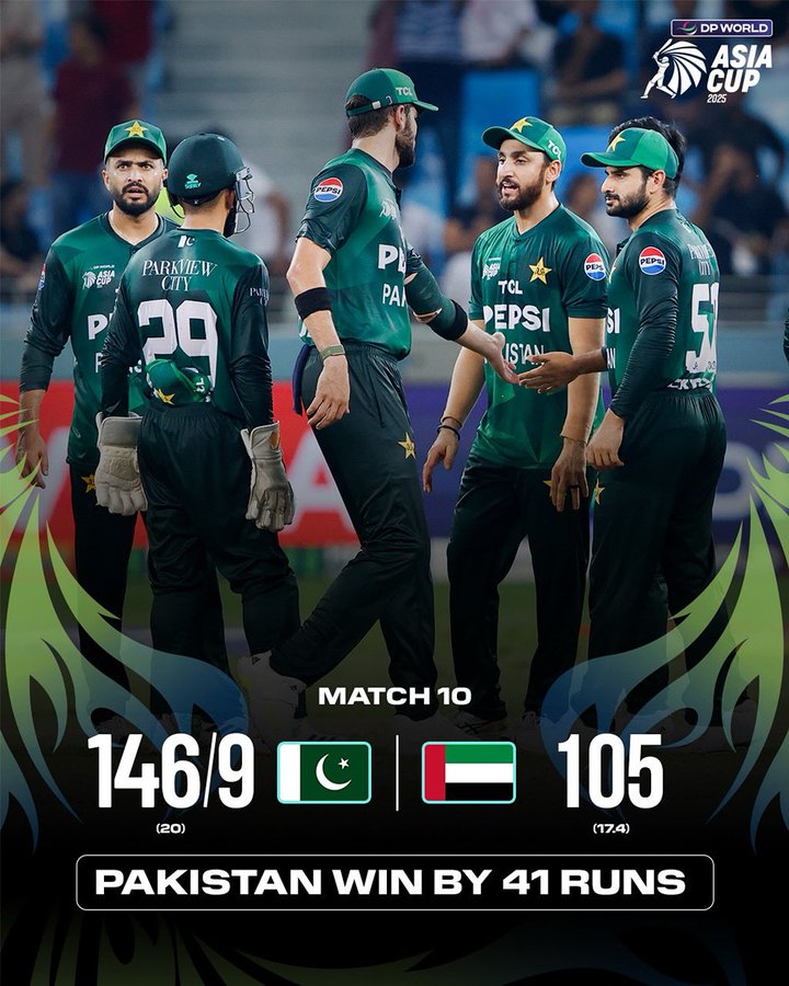 दुबई : आशिया कप 2025 स्पर्धेतील 10 व्या सामन्यात पाकिस्तानने यजमान यूएईवर 41 धावांनी मात करत साखळी फेरीतील आपला दुसरा विजय मिळवला आहे. पाकिस्तानने यूएईला 147 धावांचं आव्हान दिलं होतं. त्यामुळे यूएई हे विजयी आव्हान पूर्ण करत उलटफेर करेल, अशी आशा क्रिकेट चाहत्यांना होती. मात्र पाकिस्तानच्या गोलंदाजांसमोर यूएईला 20 ओव्हरही खेळता आलं नाही. पाकिस्तानने यूएईला 17.4 ओव्हरमध्ये 105 रन्सवर ऑलआऊट केलं. पाकिस्तान या विजयासह बी ग्रुपमधून टीम इंडियानंतर सुपर 4 मध्ये प्रवेश करणारी दुसरी टीम ठरली आहे. त्यामुळे भारत विरुद्ध पाकिस्तान यांच्यात साखळी फेरीनंतर सुपर 4 मध्ये लढत होणार आहे.