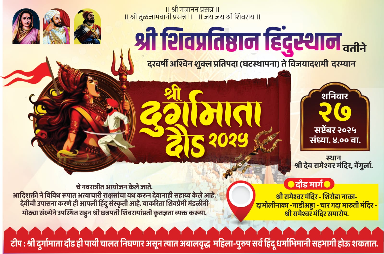 नवरात्रोत्सव हा शक्तीची आराधना आणि भक्तिभावाचा उत्सव मानला जातो. या पार्श्वभूमीवर दुर्गामाता दौड ही तरुणाईच्या शौर्य, पराक्रम आणि भक्तीभावाची प्रचिती घडवणारी ठरते. ढोल-ताशांचा गजर, जयघोष, भगवे झेंडे आणि पारंपरिक वेशभूषा यामुळे वेंगुर्ल्याच्या रस्त्यांवर उत्सवमय वातावरण निर्माण होणार आहे.