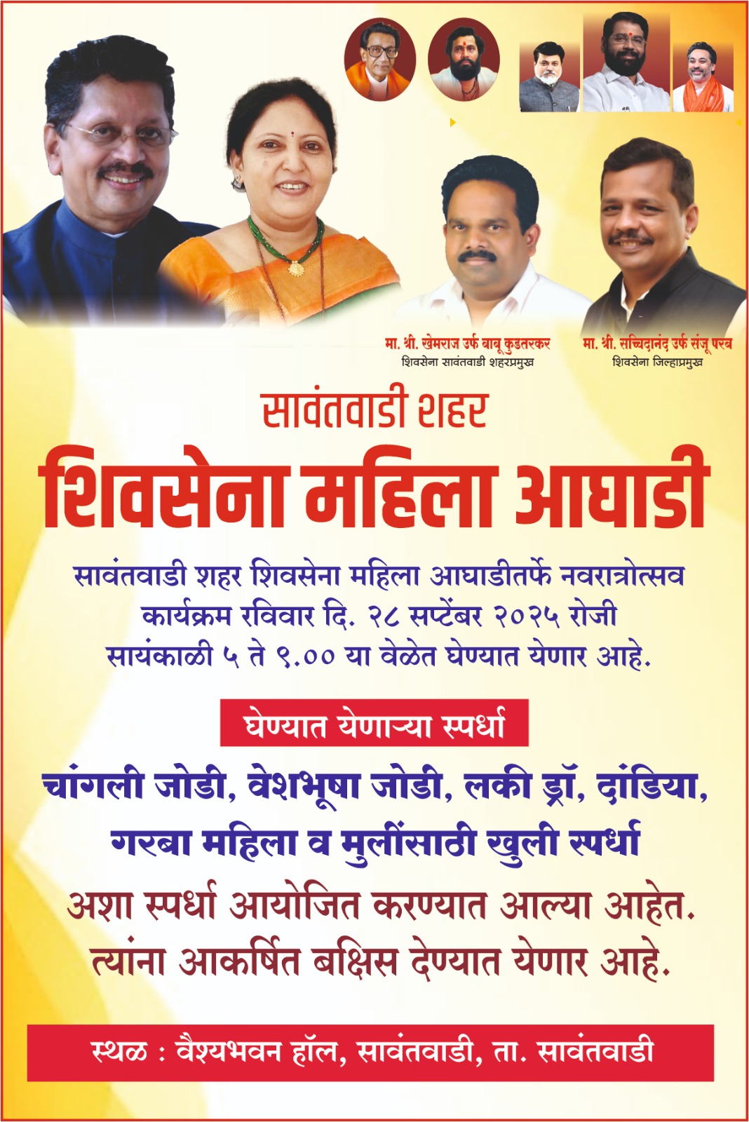 सावंतवाडी : सावंतवाडी शहर शिवसेना महिला आघाडीतर्फे नवरात्रोत्सवाचे औचित्य साधून उद्या रविवार, दिनांक २८ सप्टेंबर २०२५ रोजी महिलांसाठी विविध सांस्कृतिक व मनोरंजनात्मक स्पर्धांचे आयोजन करण्यात आले आहे. या कार्यक्रमाचे आयोजन सायंकाळी ५ ते रात्री १० वाजेपर्यंत वैश्य भवन हॉल, सावंतवाडी येथे होणार आहे.