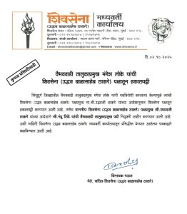वैभववाडी : वैभववाडी उबाठा सेनेचे तालुकाप्रमुख मंगेश लोके यांची पक्षातून हकालपट्टी करण्यात आली आहे. उबाठाचे पक्षप्रमुख उद्धव बाळासाहेब ठाकरे यांच्या आदेशानुसार सचिव विनायक राऊत यांनी त्यांची पक्षातून हकालपट्टी केली आहे. पक्षविरोधी कारवाया केल्यामुळे त्यांची पक्षातून हकालपट्टी करण्यात आल्याचे पत्रात नमूद करण्यात आले आहे. हकालपट्टी करण्यात आल्याची माहिती उबाठा सेना मध्यवर्ती कार्यालय यांच्याकडून प्रसिद्धीस देण्यात आलेल्या पत्रकाद्वारे कळविण्यात आली आहे.
