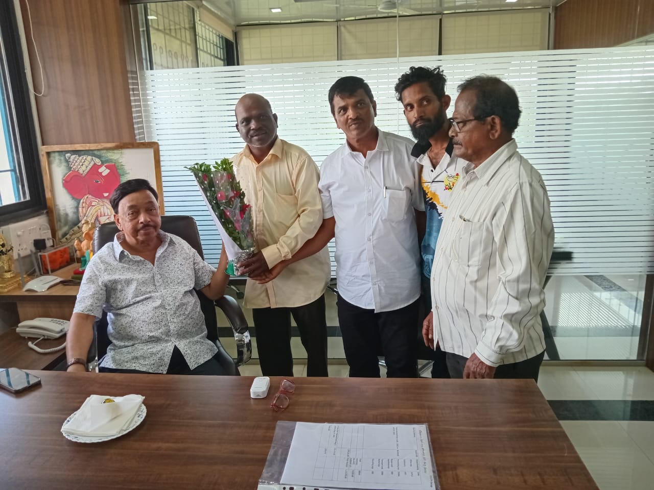 सावंतवाडी : माजी शिक्षण व आरोग्य सभापती तथा श्री विठ्ठल रखुमाई शेतकरी संघटनेचे अध्यक्ष मंगेश तळवणेकर यांनी माजी मुख्यमंत्री तथा विद्यमान खासदार नारायण राणे यांची भेट घेतली. यावेळी नारायण राणे यांनी अनेक वर्षानंतर भेटलेल्या मंगेश तळवणेकर यांची आपुलकीने चौकशी केली. तसेच ‘मंगेश काही काम असल्यास अवश्य हाक मार, आम्ही आहोत तुझ्यासोबत!, असे आश्वासित करून शाबासकीची थाप दिली. यावेळी लक्ष्मण देऊलकर, रामकृष्ण परब, नारायण कारीवडेकर आदी उपस्थित होते.