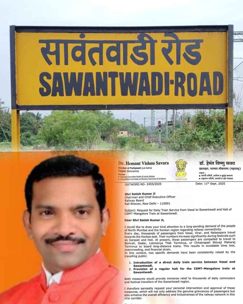 सावंतवाडी : पालघरचे खासदार डॉ. हेमंत विष्णू सावरा यांनी वसई, विरार आणि नालासोपारा परिसरातून कोकणात प्रवास करणाऱ्या हजारो प्रवाशांच्या सोयीसाठी एक महत्त्वपूर्ण पाऊल उचलले आहे. त्यांनी रेल्वे बोर्डाचे अध्यक्ष आणि मुख्य कार्यकारी अधिकारी श्री सतीश कुमार यांना पत्र लिहून वसई ते सावंतवाडी दरम्यान दररोज थेट रेल्वेसेवा सुरू करण्याची आणि १३१३३/३४ सी.एस.एम.टी. – मंगलोर एक्सप्रेसला सावंतवाडी स्थानकावर थांबा देण्याची मागणी केली आहे.