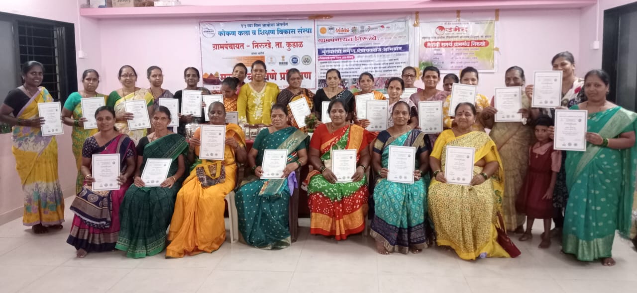 कुडाळ : कोकण कला व शिक्षण विकास संस्था आणि ग्रामपंचायत निरूखे यांच्या संयुक्त विद्यमाने 14 व 15 ऑक्टोबर 2025 रोजी आयोजित केलेल्या मसाले बनविण्याच्या प्रशिक्षण कार्यशाळेने ग्रामीण महिलांसाठी स्वावलंबनाचा नवा मार्ग उघडला आहे. या उपक्रमात ग्रामपंचायत कार्यक्षेत्रातील 28 महिलांनी उत्स्फूर्त सहभाग घेतला. प्रशिक्षणाचे उद्घाटन सरपंच कीर्तिकुमार तेरसे यांच्या हस्ते पार पडले. यावेळी अनेक मान्यवर उपस्थित होते.