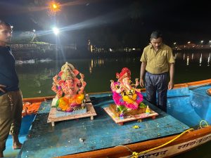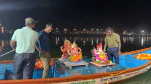 सावंतवाडी : कोकणातील सर्वात मोठा सण म्हणजे गणेशोत्सव. लाखो भाविक कोकणात आपल्या लाडक्या बाप्पाला पुजण्यासाठी येत असतात. काही गणेश भक्तांचा बाप्पा दीड दिवस, तीन दिवस, पाच दिवस, सात दिवस, अकरा दिवसांपर्यंतही मुक्कामी असतो. तळकोकणातील सावंतवाडी येथे आज पाचव्या दिवशी गणेशभक्तांनी आपल्या लाडक्या बाप्पाला भावपूर्ण निरोप दिला. ‘बाप्पा चालले आपल्या गावाला, चैन आम्हा पडेना’, ‘गणपती बाप्पा मोरया, पुढील वर्षी लवकर या.!’, असा जोरदार गजर करत गणेश भक्तांनी आपल्या लाडक्या बाप्पाला आज भावपूर्ण निरोप दिला. यावेळी अनेक बाल गणेशभक्तांचे डोळे पाणावले. सावंतवाडीच्या ऐतिहासिक मोती तलावात अनेक गणेश भक्तांनी लाडक्या बाप्पाचे आज पाचव्या दिवशी विसर्जन केले. बाप्पाच्या विसर्जना वेळी अनेकांना आपल्या डोळ्यातील अश्रू लपवता आले नाहीत. हे देखील आज गणेश भक्तांची भक्ती काय असते ते सांगून गेले.