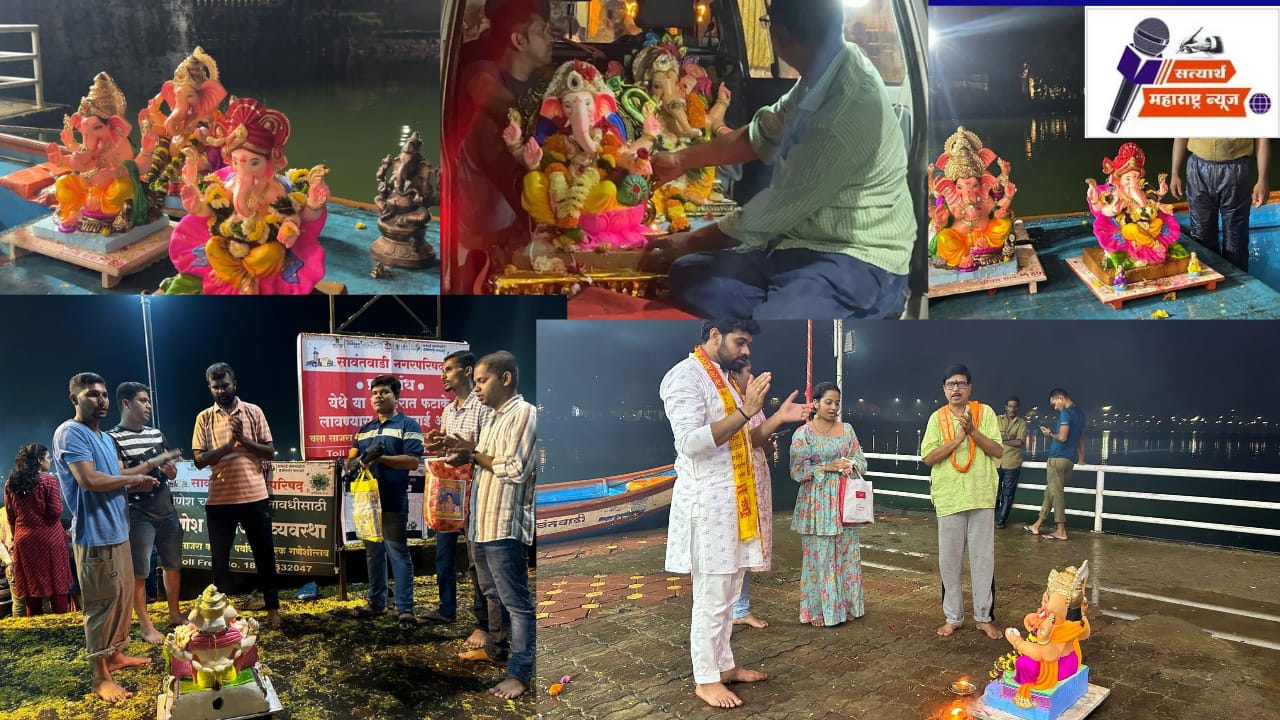 सावंतवाडी : कोकणातील सर्वात मोठा सण म्हणजे गणेशोत्सव. लाखो भाविक कोकणात आपल्या लाडक्या बाप्पाला पुजण्यासाठी येत असतात. काही गणेश भक्तांचा बाप्पा दीड दिवस, तीन दिवस, पाच दिवस, सात दिवस, अकरा दिवसांपर्यंतही मुक्कामी असतो. तळकोकणातील सावंतवाडी येथे आज पाचव्या दिवशी गणेशभक्तांनी आपल्या लाडक्या बाप्पाला भावपूर्ण निरोप दिला. ‘बाप्पा चालले आपल्या गावाला, चैन आम्हा पडेना’, ‘गणपती बाप्पा मोरया, पुढील वर्षी लवकर या.!’, असा जोरदार गजर करत गणेश भक्तांनी आपल्या लाडक्या बाप्पाला आज भावपूर्ण निरोप दिला. यावेळी अनेक बाल गणेशभक्तांचे डोळे पाणावले. सावंतवाडीच्या ऐतिहासिक मोती तलावात अनेक गणेश भक्तांनी लाडक्या बाप्पाचे आज पाचव्या दिवशी विसर्जन केले. बाप्पाच्या विसर्जना वेळी अनेकांना आपल्या डोळ्यातील अश्रू लपवता आले नाहीत. हे देखील आज गणेश भक्तांची भक्ती काय असते ते सांगून गेले.
