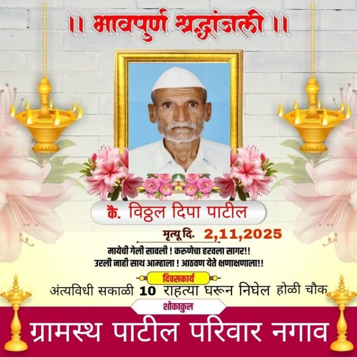 सेवानिवृत्त सहाय्यक शिक्षक सी. व्ही. पाटील यांचे ते वडील होत. त्यांची अंत्ययात्रा उद्या दिनांक ३/११/२०२५ रोजी सकाळी १० वाजता नगाव येथील राहत्या घरून निघेल.