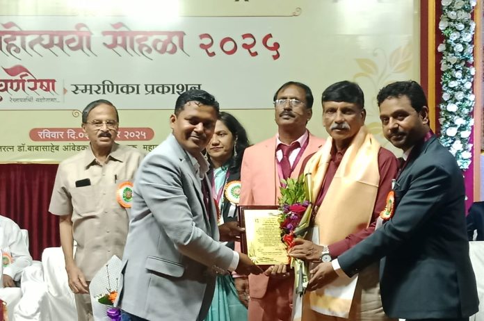 सावंतवाडी : महाराष्ट्र राज्य रेखाचित्र शाखा कर्मचारी संघटनेचा सुवर्ण महोत्सव रविवारी महाड येथील भारतरत्न डॉ. बाबासाहेब आंबेडकर स्मारक येथे संपन्न झाला. यावेळी संघटनेच्या मागील पन्नास वर्षांच्या कारकिर्दीत उल्लेखनीय कार्य करणाऱ्या सक्रिय सभासदांचा सन्मान करण्यात आला. राज्य रेखाचित्र शाखा कर्मचारी संघटनेच्या ५० व्या वर्धापन दिनाच्या औचित्याने संघटनेचे सिंधुदुर्ग जिल्हाध्यक्ष, तसेच कोमसाप सावंतवाडी शाखेचे सचिव राजू तावडे यांना राज्य संघटनेचे अध्यक्ष जकी अहमद जाफरी यांच्या हस्ते शाल, श्रीफळ, पुष्पगुच्छ व सन्मानपत्र देऊन ‘जीवन गौरव ‘ पुरस्काराने सन्मानित करण्यात आले. यावेळी राज्य सरकारी कर्मचारी मध्यवर्ती संघटनेचे सरचिटणीस श्री. विश्वास काटकर, राज्य रेखाचित्र शाखा कर्मचारी संघटनेचे सरचिटणीस सुधीर गभणे, उपाध्यक्ष रवींद्र बिंड, उपाध्यक्ष राहुल साळुंखे, कोषाध्यक्ष सौ. वंदना परिहार, अतिरिक्त सरचिटणीस विनायक जोशी, सहकोषाध्यक्ष अमोल सुपेकर, महिला प्रतिनिधी स्वाती डोकबाणे, दिपाली खोबरे, मंत्रालय संपर्कप्रमुख बन्सीलाल राठोड , श्रीकृष्ण आपटे, सुवर्ण महोत्सव कोर कमिटीचे निमंत्रित सदस्य वाल्मीक दारुणकर, राजेंद्र करपे, नझीर शेख, स्वागताध्यक्ष तथा कोकण विभागीय सचिव नरेंद्र महाडिक व सर्व विभागीय सचिव उपस्थित होते.