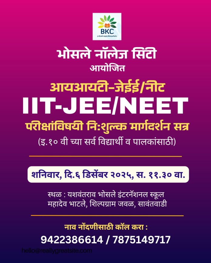 सावंतवाडी : इंजिनिअरिंग व मेडिकल क्षेत्रात प्रवेश घेऊ इच्छिणाऱ्या विद्यार्थ्यांसाठी तसेच त्यांच्या पालकांसाठी भोसले नॉलेज सिटीच्या वतीने शनिवार, 6 डिसेंबर 2025 रोजी विशेष मार्गदर्शन सत्राचे आयोजन करण्यात आलेले आहे. या सत्रामध्ये JEE व NEET परीक्षेची माहिती, तयारीची रणनीती, अभ्यास पद्धती, भविष्यातील प्रवेश प्रक्रिया याबाबत तज्ज्ञांकडून सविस्तर मार्गदर्शन केले जाणार आहे.
