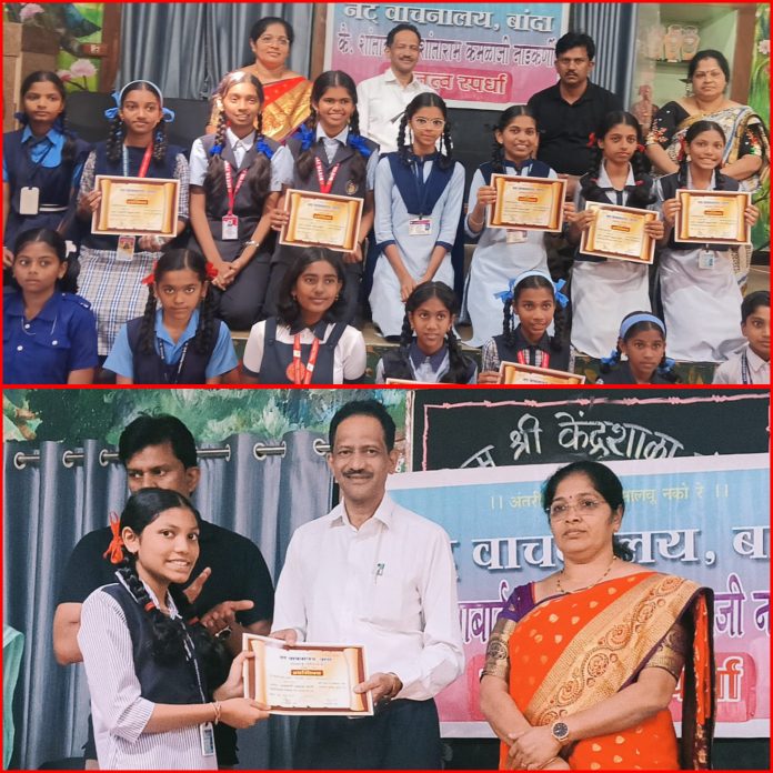 बांदा : येथील नट वाचनालयात (कै.) शशिकांत नाडकर्णी पुरस्कृत त्यांचे वडील (कै.) शांताराम नाडकर्णी व त्यांची आई (कै.) शांताबाई नाडकर्णी यांचे स्मरणार्थ आयोजित करण्यात आलेल्या शालेय वक्तृत्व स्पर्धेत मोठ्या गटात अस्मि मांजरेकर (आरपीडी हायस्कुल, सावंतवाडी) तर लहान गटात भक्ती केळुस्कर (माध्यमिक विद्यालय, इन्सुली) या विद्यार्थ्यांनी प्रथम क्रमांक मिळविला. स्पर्धेला दोन्ही गटात स्पर्धकांचा उस्फुर्त प्रतिसाद मिळाला.