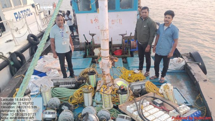 रायगड : महाराष्ट्र राज्याच्या सागरी हद्दीत अनधिकृत LED व्दारे मासेमारी करणाऱ्या रायगड जिल्हयातील 02 मासेमारी नौकांवर दिनांक 17.12.2025 रोजी व दिनांक 18.12.2025 रोजी रात्राी 02:10 वाजता मत्स्यव्यवसाय विभागाकडून गस्ती नौकेव्दारे कारवाई करण्यात आली. श्री. जगन्नाथ माया कोळी, रा. राममंदीर केळवणे, ता. पनवेल यांच्या मालकीच्या साई गणेश क्र. IND-MH-7-MM-1318 ही नौका दिनांक 17.12.2025 रोजी खदेरीच्या समोरील समुद्रात रात्री 09:30 वाजता 10 वावात अनधिकृत LED पध्दतीने मासेमारी करीता असताना मत्स्यव्यवसाय विभागाच्या गस्ती नौकेद्वारे पकडण्यात आली. तसेच दि.17.12.25 रोजी रात्री 11.00 वाजता अलिबाग समोरील समुद्रात 12 वावात मासेमारी करीत असताना श्री. यशवंत गणपत नाखवा रा.साखरकोळीवाडा पो.आक्षी ता.अलिबाग जि.रायगड यांच्या मालकीची हेरंब कृपा IND-MH-3-MM-4194 ही नौका अनिधकृत एलएईडी पध्दतीने मासेमारी करीत असताना मत्स्यव्यवसाय विभागाच्या गस्ती नौकेद्वारे पकडण्यात आली.तसेच दि.18.12.25 रोजी सकाळी 6 वाजता श्री.प्रकाश तुकाराम पाटील रा.करंजा ता.उरण जि.रायगड यांची मासेमारीनौका श्रीसमर्थ कृपा क्रं.IND-MH-7-MM-3627 या नौकेची विभागाच्या गस्तीनौकेवरून तपासणी केली असता सदर नौकेत 1) 4000 वॅटचे अंडर वॉटर एलएईडीचे लाईटचे चार नग २) 3000 वॅटचे अंडर वॉटर एलएईडीचे लाईटचे तीन नग 3) 2500 वॅटचे अंडर वॉटर एलएईडीचे लाईटचे एक नग 4) सीया लाईट 1000 वॅटचे 16 नग ५) चारशे वॅटचे 2 नग हॅलोजन बल्ब ६) एक जनरेटर असे अनिधकृत एलएईडी मासेमारी करण्याचे साहित्य पकडण्यात आले आहे.