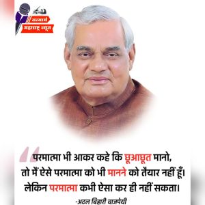 अटलजींचे दुसरे नावं म्हणजे माणुसकी,अटलजी म्हणजे राष्ट्रभक्तीचा आणि प्रखर राष्ट्रवादाचा धगधगता निखारा ,अटलजी म्हणजे कणखरपणा,अटलजी म्हणजे द्रुढ निश्चय,अटलजी म्हणजे सळसळता स्वच्छ प्रवाह,अटलजी म्हणजे सदसद्विवेक बुद्धी ,अटलजी म्हणजे संवेदनशीलता,अटलजी म्हणजे “मीपणाच्या” अहंकाराला तिलांजली देऊन देशात शांतता नांदावी,सौहार्दपूर्ण वातावरण निर्माण व्हावे यासाठी सर्वसमावेशक राजकारण करणारा दुर्मिळ नेता. अटलजी म्हणजे त्याग आणि तपस्या.