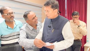 सावंतवाडी : ‘भ्रष्ट अनितीला करा लक्ष, न्याय हक्कासाठी व्हा दक्ष.!‘ या टॅग लाईनखाली संपूर्ण महाराष्ट्र राज्यात कार्यरत असणाऱ्या स्वाभिमानी मराठी पत्रकार संघ, महाराष्ट्र राज्य संघटनेचा राज्यस्तरीय पुरस्कार वितरण व वर्धापन दिन सोहळा रविवार, दिनांक ६ ऑक्टोबर 2024 रोजी धुळे महानगरीत होत आहे. या कार्यक्रमाचे उद्घाटक म्हणून राज्याचे शालेय शिक्षण व मराठी भाषा मंत्री नामदार दीपक केसरकर असणार आहेत. आज मंत्री दीपक केसरकर यांना स्वाभिमानी मराठी पत्रकार संघाचे संस्थापक अध्यक्ष रामकृष्ण नेरकर तसेच प्रदेश अध्यक्ष किरण बागुल यांच्या सूचनेनुसार कोकण विभाग अध्यक्ष प्रा. रुपेश पाटील व सिंधुदुर्ग जिल्हाध्यक्ष जय भोसले यांनी मंत्री दीपक केसरकर यांना सदर राज्यस्तरीय पुरस्कार वितरण व वर्धापन दिन सोहळ्याचे निमंत्रण दिले. यावेळी खूप छान कार्यक्रम आयोजित केला त्याबद्दल स्वाभिमानी मराठी पत्रकार संघ महाराष्ट्र राज्याचे अभिनंदन करत मंत्री दीपक केसरकर यांनी आपण सदर सोहळ्याला उपस्थित राहून उद्घाटक म्हणून आपण नक्कीच उपस्थित राहू, अशी ग्वाही कोकण प्रदेशाध्यक्ष प्रा. रुपेश पाटील व सिंधुदुर्ग जिल्हाध्यक्ष जय भोसले यांना दिली.