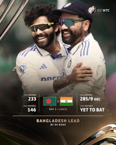 भारत आणि बांग्लादेश यांच्यातील दुसरा कसोटी सामन्यात भारतीय संघाला विजयासाठी 95 धावांचं आव्हान देण्यात आलं आहे. बांगलादेशने दुसऱ्या डावात 10 विकेट्स गमावत 146 धावा केल्या.  बांगलादेशकडून शादमान इस्लामने सर्वाधिक 50 धावा केल्या. तर पहिल्या डावात शतक झळकावणाऱ्या मोनीमूल हक दुसऱ्या डावात मोठी खेळी करण्यात अपयशी ठरला. मोनीमूल हकने 8 चेंडूत फक्त 2 धावा केल्या. तर झाकीर हुसैनने 10, हसन महमूदने 4, कर्णधार नजमूल शांतोने 19, लिटन दासने 1, मेहंदी हसनने 9, मुस्तफिझूर रहीमने 37 धावा केल्या. भारतीय संघाच्या गोलंदाजांनी कसोटीच्या दोन्ही डावात अप्रतिम कामगिरी केली. दुसऱ्या डावात भारताकडून रविचंद्रन अश्विनने 3, रवींद्र जडेजा 4, आकाश दीपने 1, जसप्रीत बुमराहने 3 विकेट्स पटकावल्या.