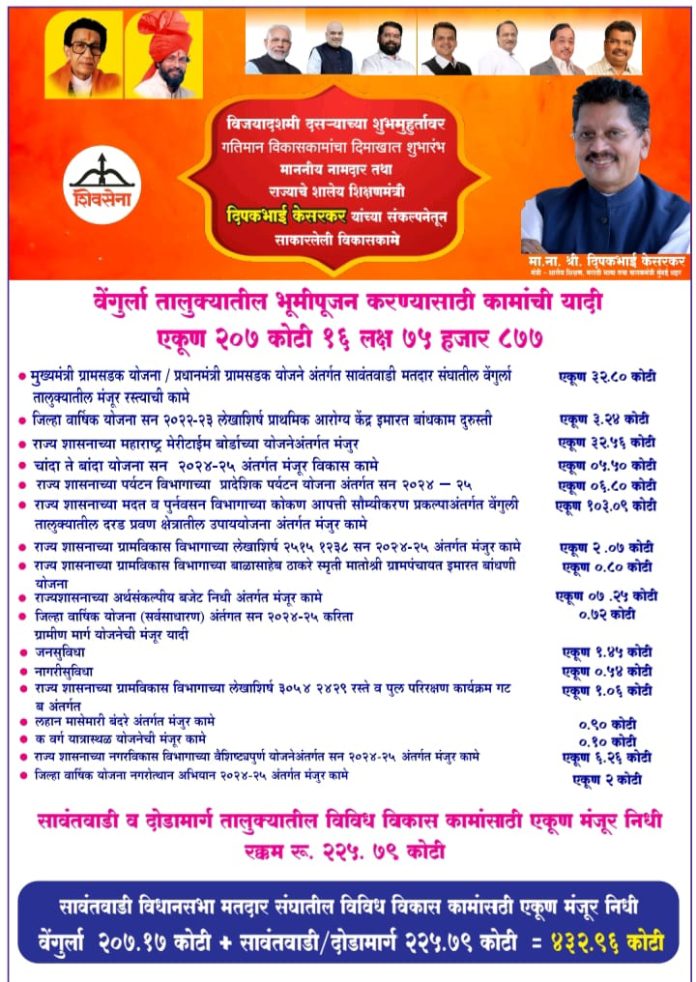 सावंतवाडी विधानसभा मतदार संघातील विविध विकास कामांसाठी एकूण मंजूर निधी वेंगुर्ला २०७.१७ कोटी + सावंतवाडी/दोडामार्ग २२५.७९ कोटी ४३२.९६ कोटी