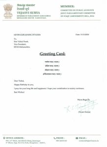 खासदार श्री. सूर्य यांनी विशाल परब यांना ग्रीटिंग कार्डच्या माध्यमातून शुभेच्छा दिल्या आहेत.