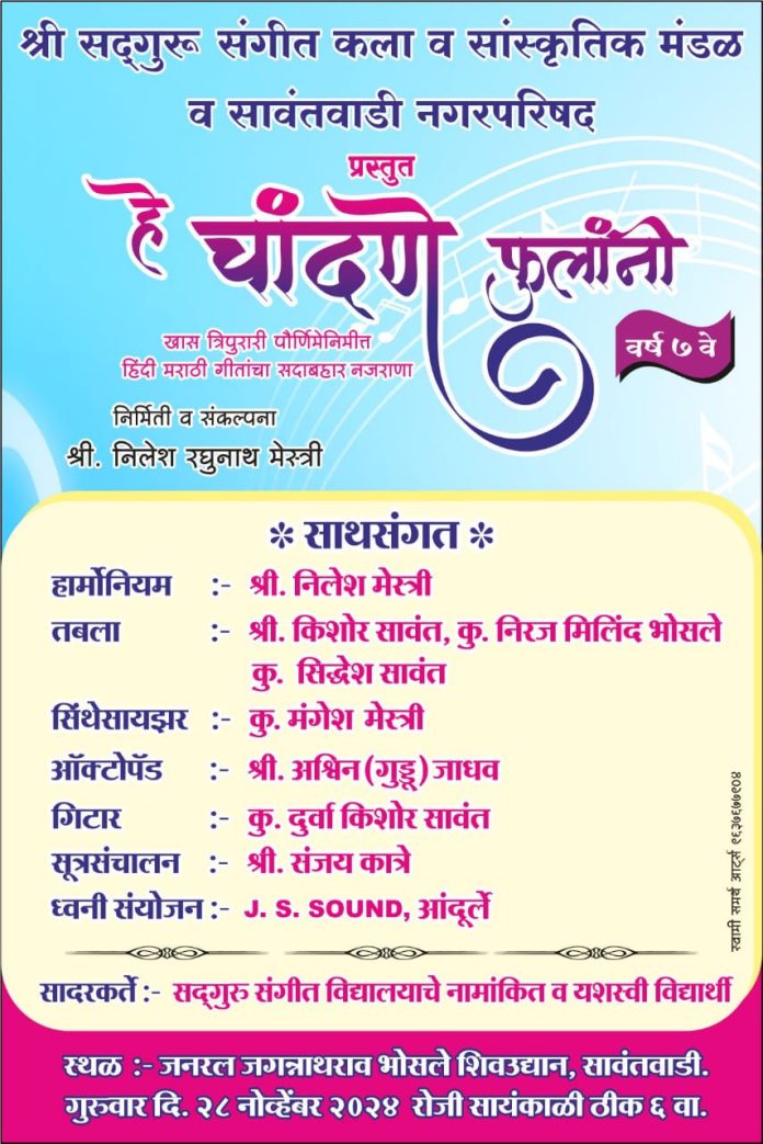 सावंतवाडी : श्री सद्गुरु संगीत कला व सांस्कृतिक मंडळ,सावंतवाडी व सावंतवाडी नगरपरिषद यांच्या संयुक्त विद्यमाने सलग सातव्या वर्षी खास त्रिपुरारी पौर्णिमेनिमित्त “हे चांदणे फुलांनी…” (वर्ष 7 वे) जुन्या – नव्या हिंदी व मराठी गीतांचा सदाबहार नजराणा या कार्यक्रमाचे आयोजन करण्यात आले आहे. गुरुवार दि. 28 नोव्हेंबरला सायंकाळी 6 वा. जनरल जगन्नाथराव भोसले शिवउद्यान सावंतवाडी (गार्डन) येथे ही मैफिल रंगणार आहे.